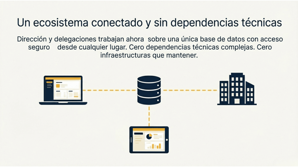 La automatización de procesos contables reforzó todavía más el cambio. Las conciliaciones bancarias se sistematizaron, los flujos de aprobación se integraron dentro del propio sistema y se eliminaron numerosas tareas repetitivas que generaban errores y retrasos. El cierre dejó de ser un proceso desordenado y pasó a ejecutarse con mayor previsibilidad y control. Además, el acceso seguro desde cualquier lugar permitió que dirección y delegaciones trabajaran sobre una única base de datos, sin dependencias de infraestructuras locales ni configuraciones técnicas complejas.