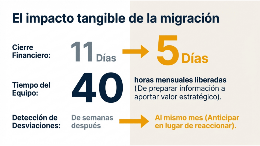 El resultado fue tangible: el cierre financiero se redujo de once a cinco días y se liberaron aproximadamente 40 horas mensuales del equipo financiero. Ese tiempo dejó de dedicarse a preparar información y empezó a invertirse en analizar márgenes, anticipar tensiones de tesorería y apoyar decisiones estratégicas.